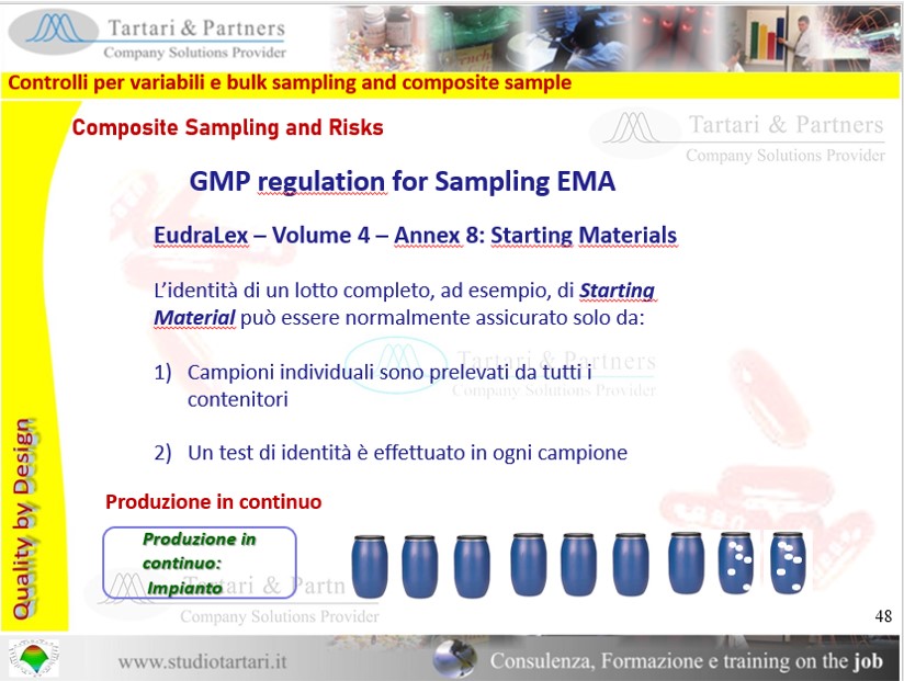 Questo corso è interamente dedicato al Bulk Production, PRODUZIONE IN CONTINUO e non per singolo lotto isolato. Il partecipante apprenderà le modalità operative per implementare il CPV durante la produzione in continuo e apprenderà, inoltre, le metodologie del campionamento secondo standard internazionali. Verranno indicati anche gli aspetti negativi, per il cliente, del piano di campionamento n = [Radq(N)+1] (Vedere AFI: Buone Pratiche di Fabbricazione. Vol. 13, pag. 296) e del connesso "Composite sampling" (EudraLex – Volume 4 – Annex 8).